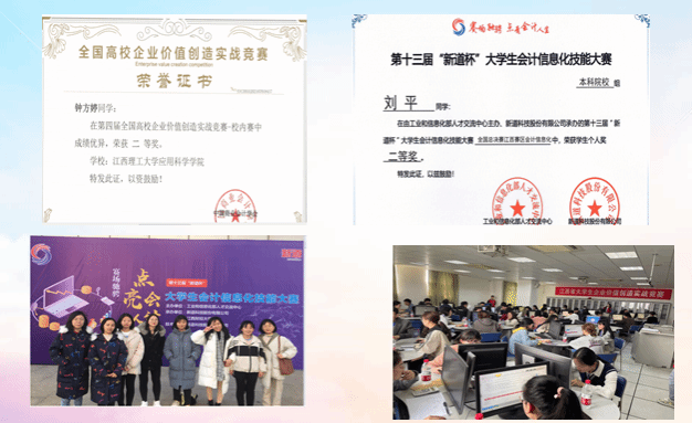 本专业确立了“校企结合、证书导向”的人才培养模式。利用“大数据财务分析、python基础、用友ERP业财一体化、会计分岗位竞赛系统、会计信息化教考系统”等软件,开展校内实践活动,培养学生的动手能力;与九江银行、赣州猎鹰投资管理公司、赣州中浩会计事务所等企业建立校外实践基地,培养学生的就业竞争力;鼓励学生参加会计专业职称考试和各种学科竞赛,培养学生的创新力。