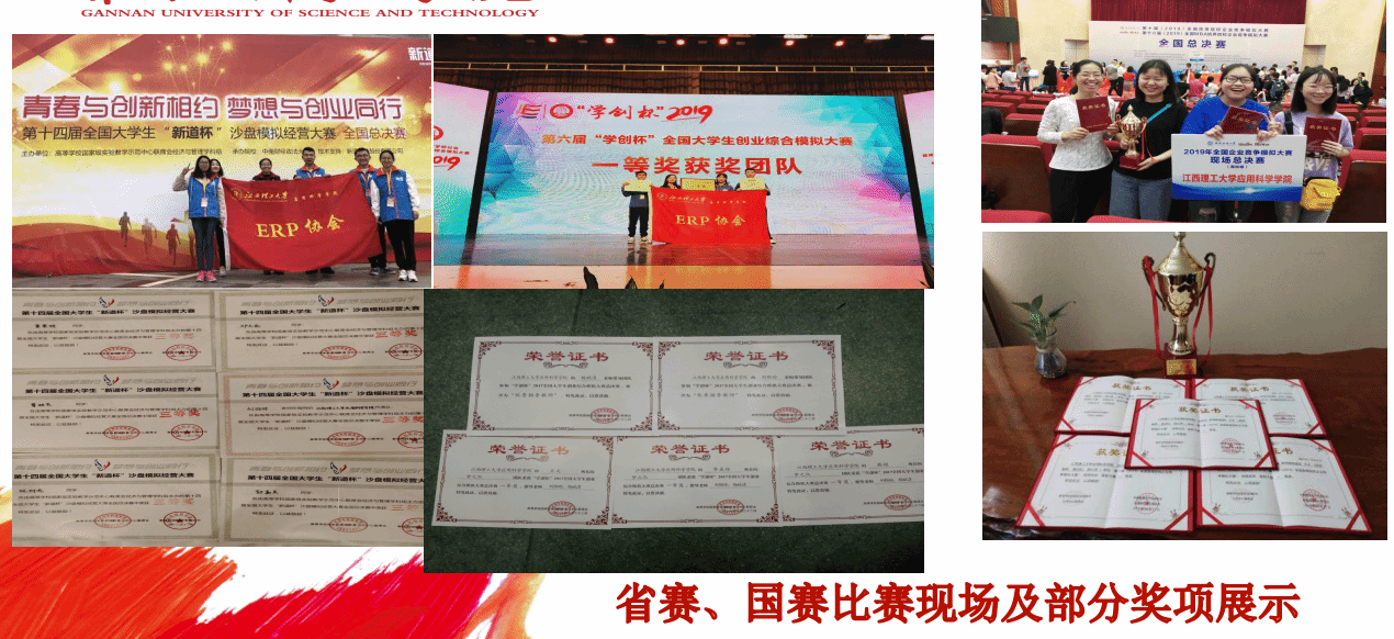本专业为了加强学生实践能力,培养学生的团队合作精神,创立了ERP(企业资源计划)沙盘协会协会,每年平均举办学科竞赛培训活动达十余项次,营造了良好的“以赛促教、以赛促学”的竞赛学习氛围,累计获奖总数达到283项,其中国家级奖项185项,一等奖26项,二等奖86项,三等奖73项;省级级奖98项,其中一等奖24项,二等奖35项,三等奖39项。