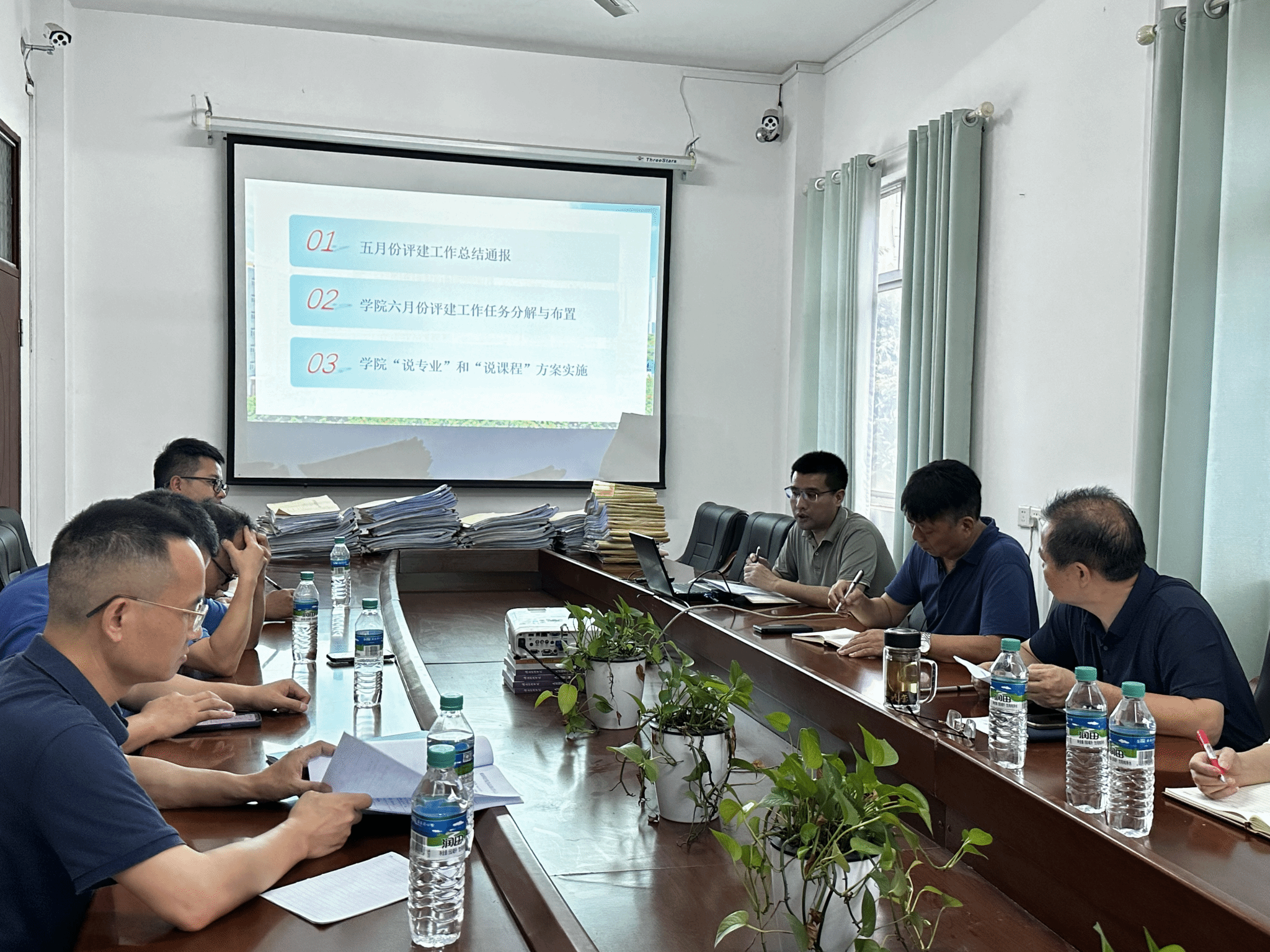 会上,钟滨对学院五月份的评建工作进行总结,通报了“狠抓落实、迎评促建”大学习大讨论、“六说”活动、毕业实习材料检查、教案检查、教风学风情况、教师开展听课情况和校外实习基地建设等方面的情况。对于以上工作,钟滨指出了一些需要改进的方面且提出了具体的措施。同时,他对六月份评建需要推进的重点工作特别是“六说”活动进行具体部署。