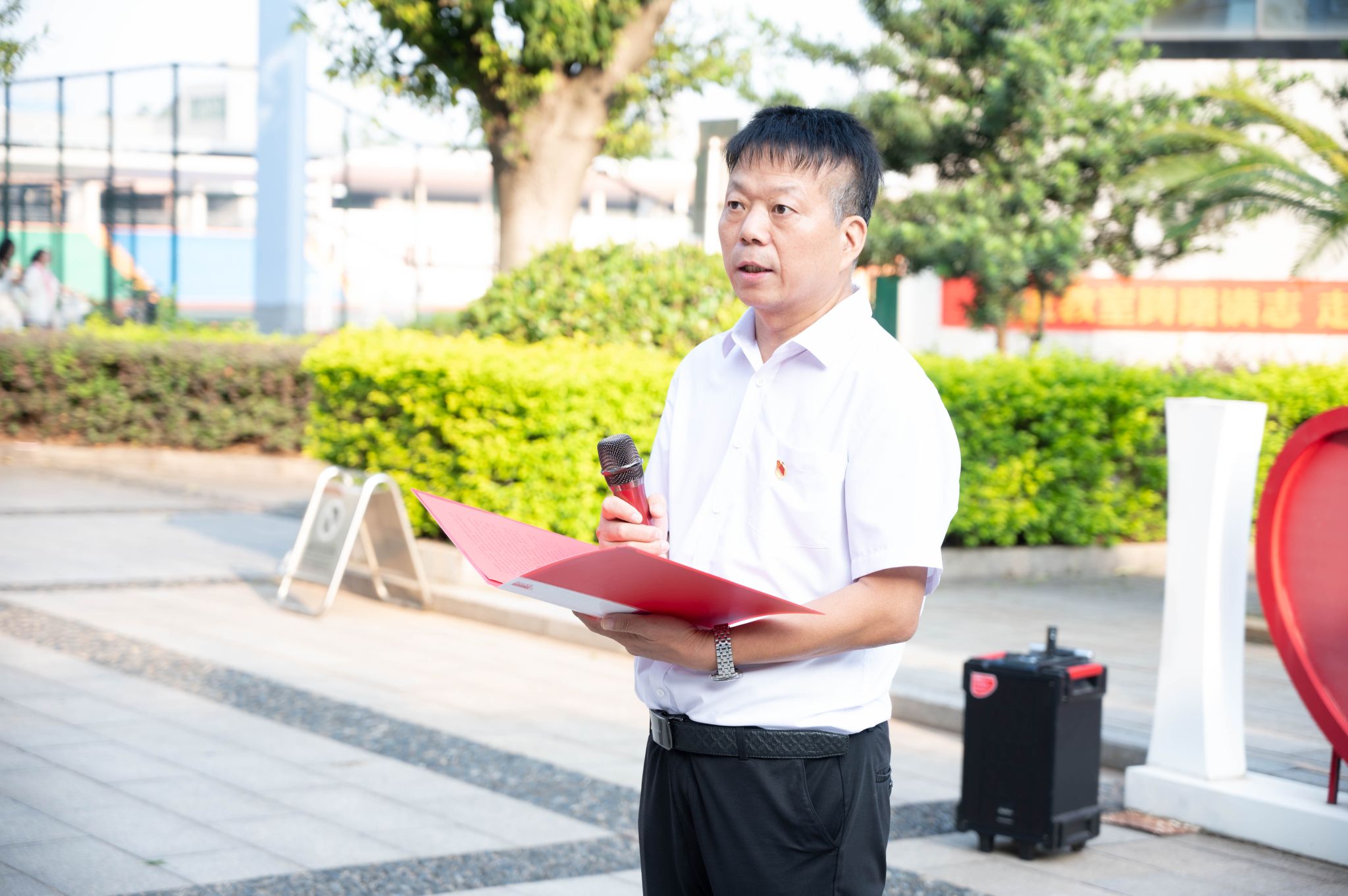 活动伊始,国旗护卫队护卫国旗入场,在庄严的国歌声中,五星红旗冉冉升起,全体师生面向国旗行注目礼。随后,团员代表蓝康祺发言,她表示青年要以实际行动践行爱国主义精神,为中华民族伟大复兴而奋斗。学生党员代表陈学龙表示,在党的领导下,青年要砥砺前行,为祖国伟大事业作贡献。教师党员代表王诗琪则围绕国家教育事业的成就与发展,表示将以教育家为榜样,把教育家精神内化为教书育人能力,努力为学校发展作出更大贡献。