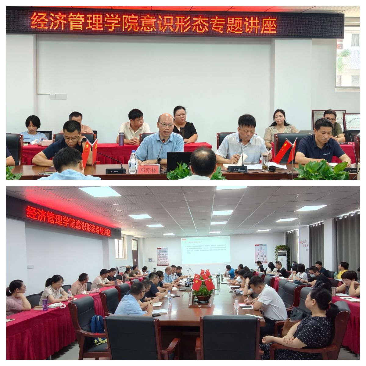 邓亦林围绕“意识形态是什么、为什么、做什么、有什么、怎么做”等五个维度系统展开讲解。讲座从理论层面阐释意识形态的核心内涵与战略意义,明确指出高校是意识形态工作的前沿阵地,强调教师必须始终牢牢把握 “为谁培养人、培养什么人、怎样培养人” 这一教育根本问题,将意识形态引领贯穿教育教学全过程。随后,邓亦林结合相关典型案例,深入剖析当前高校意识形态领域面临的风险挑战,强调立德树人是教育的初心所系、使命所在。就如何做好意识形态工作,邓亦林提出了四点建议:一是明确职责,教书育人;二是守好底线,坚定理想;三是站稳立场,敢于斗争;四是用好网络,守好阵地。邓亦林强调,意识形态工作没有“休止符”,只有“进行曲”;没有“旁观者”,只有“战斗员”。希望全体教师以“三尺讲台”为站位,以“立德树人”为使命,用“明确职责”的清醒、“守好底线”的坚定、“敢于斗争”的勇毅,“筑牢阵地”的担当,共同筑起新时代高校意识形态的“钢铁长城”,为培养担当民族复兴大任的时代新人贡献智慧和力量。