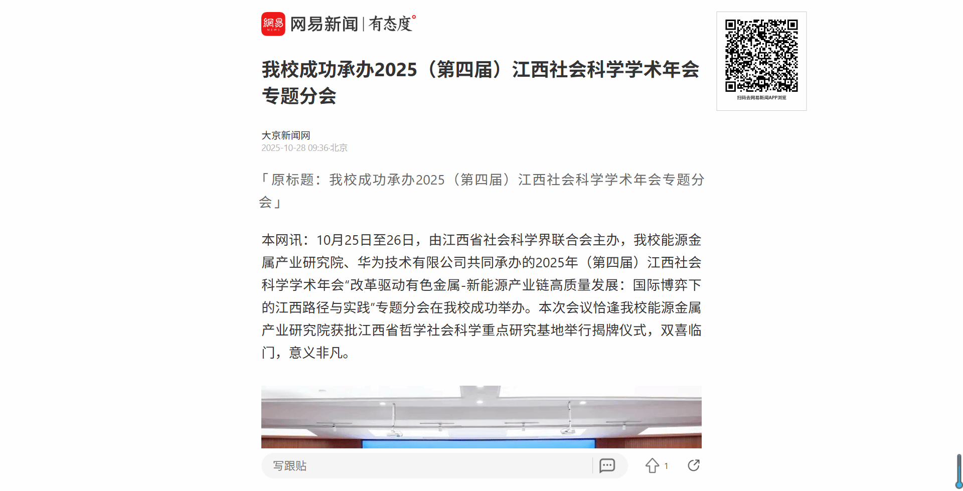 本网讯:10月25日至26日,由江西省社会科学界联合会主办,我校能源金属产业研究院、华为技术有限公司共同承办的2025年(第四届)江西社会科学学术年会“改革驱动有色金属-新能源产业链高质量发展:国际博弈下的江西路径与实践”专题分会在我校成功举办。本次会议恰逢我校能源金属产业研究院获批江西省哲学社会科学重点研究基地举行揭牌仪式,双喜临门,意义非凡。