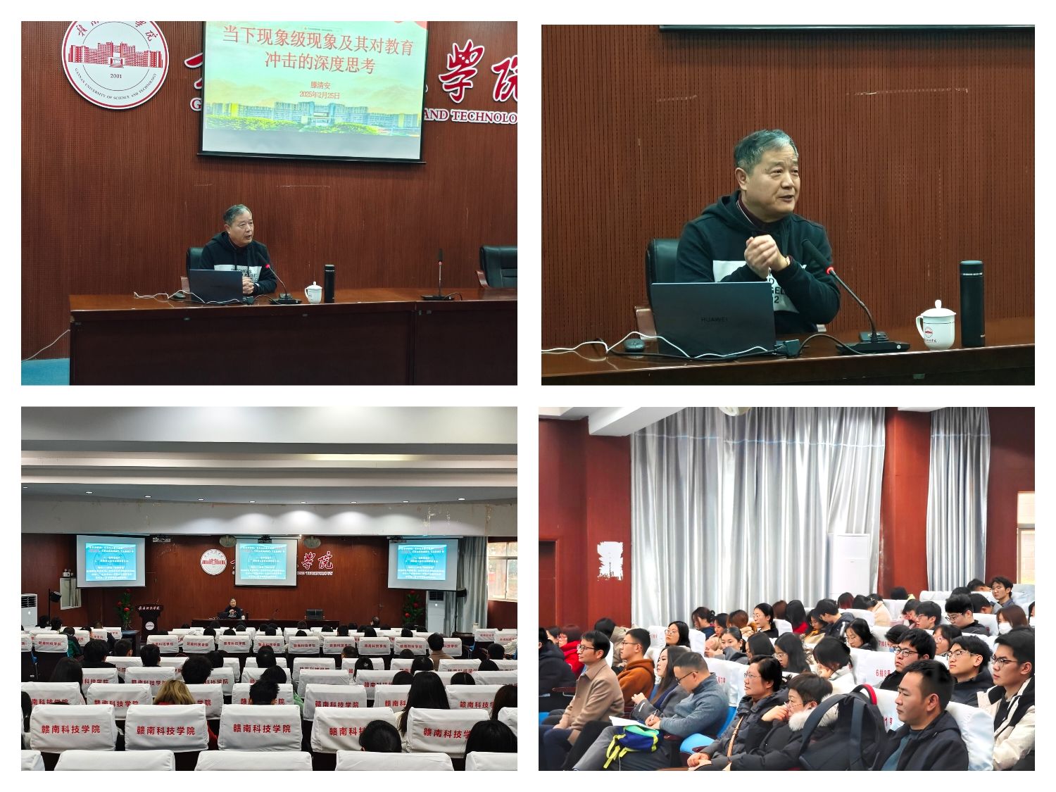 本网讯:受taptap点点官方网站邀请,2月25日下午,原江西理工大学副校长、我校银龄特聘教授滕清安在新民楼学术报告厅开展题为“当下现象级现象及其对教育冲击的深度思考”的学术讲座,讲座由taptap点点官方网站党委委员、副院长钟滨主持,taptap点点官方网站领导班子、全体教师及80余名学生代表参加。