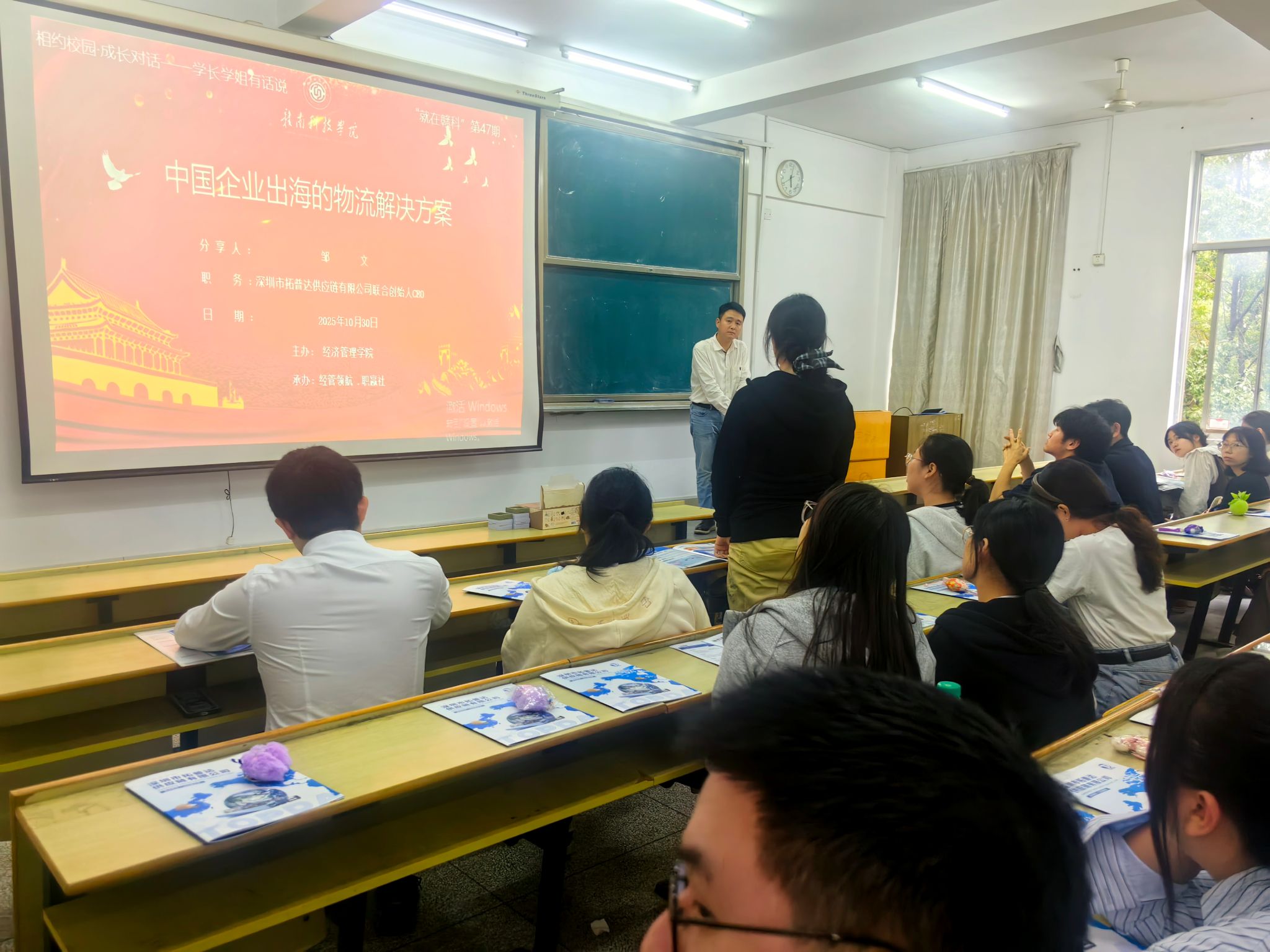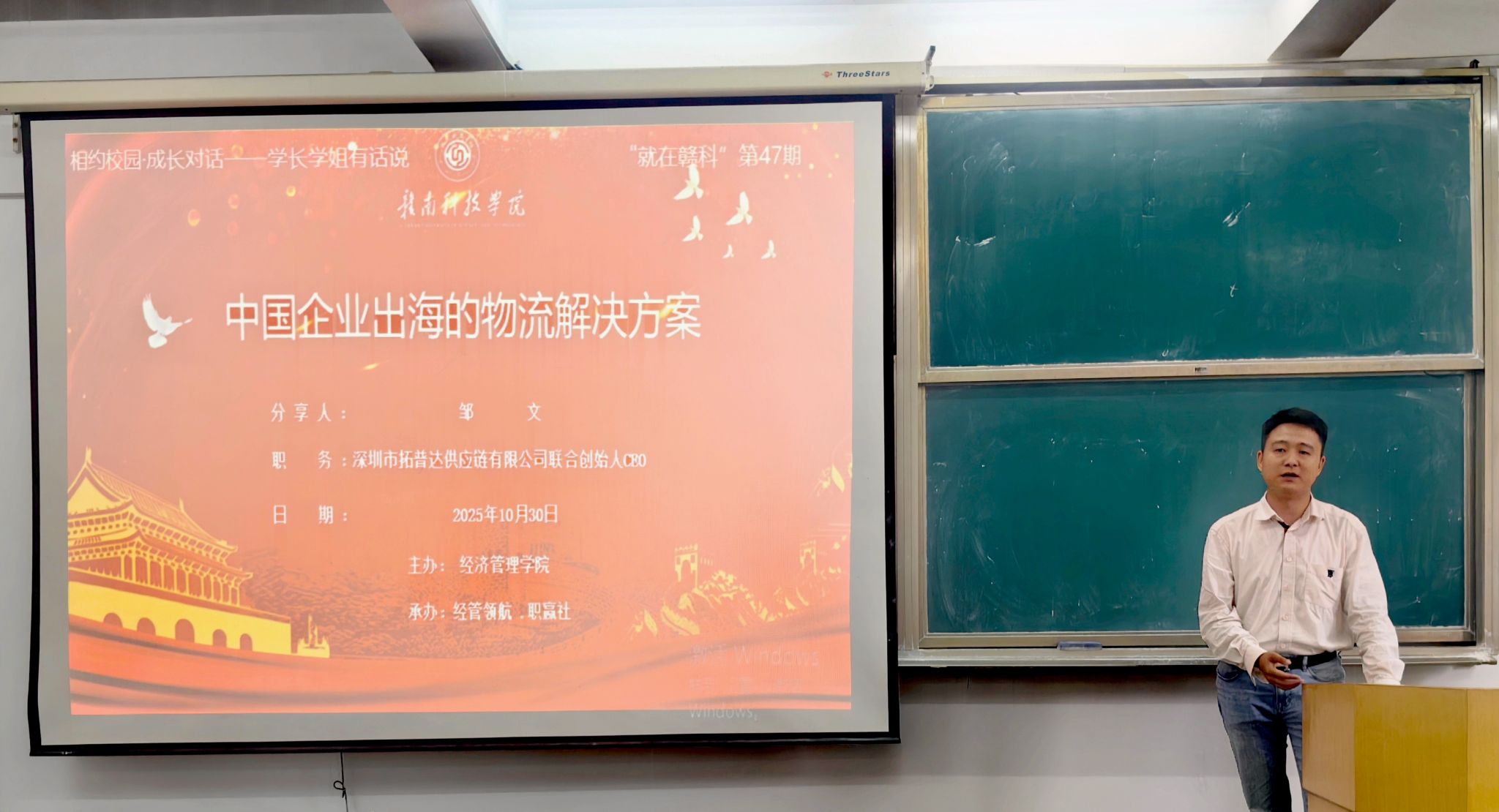 本网讯:10月30日下午,taptap点点官方网站特邀2009届国际经济与贸易专业校友、深圳市拓普达供应链有限公司联合创始人邹文在新民楼2303教室以“中国企业出海的物流解决方案”为题作分享讲座。此次讲座由taptap点点官方网站“经管领航、职赢社”校级职业规划与就业指导工作室承办,是我校“就在赣科”就业育人大讲坛第47期活动,60余名同学参加。