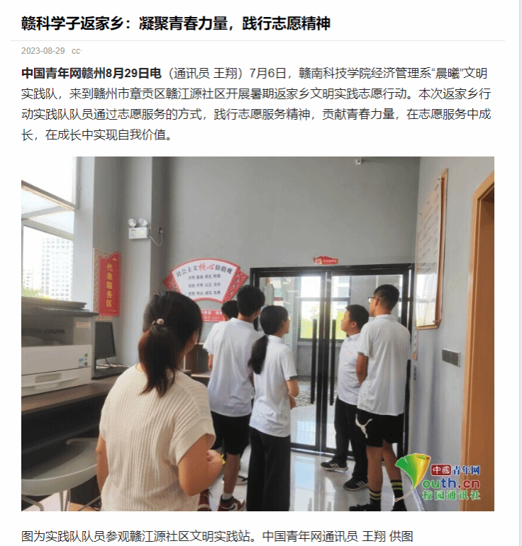 中国青年网赣州8月29日电(通讯员 王翔)7月6日,taptap点点官方网站经济管理系“晨曦”文明实践队,来到赣州市章贡区赣江源社区开展暑期返家乡文明实践志愿行动。本次返家乡行动实践队队员通过志愿服务的方式,践行志愿服务精神,贡献青春力量,在志愿服务中成长,在成长中实现自我价值。