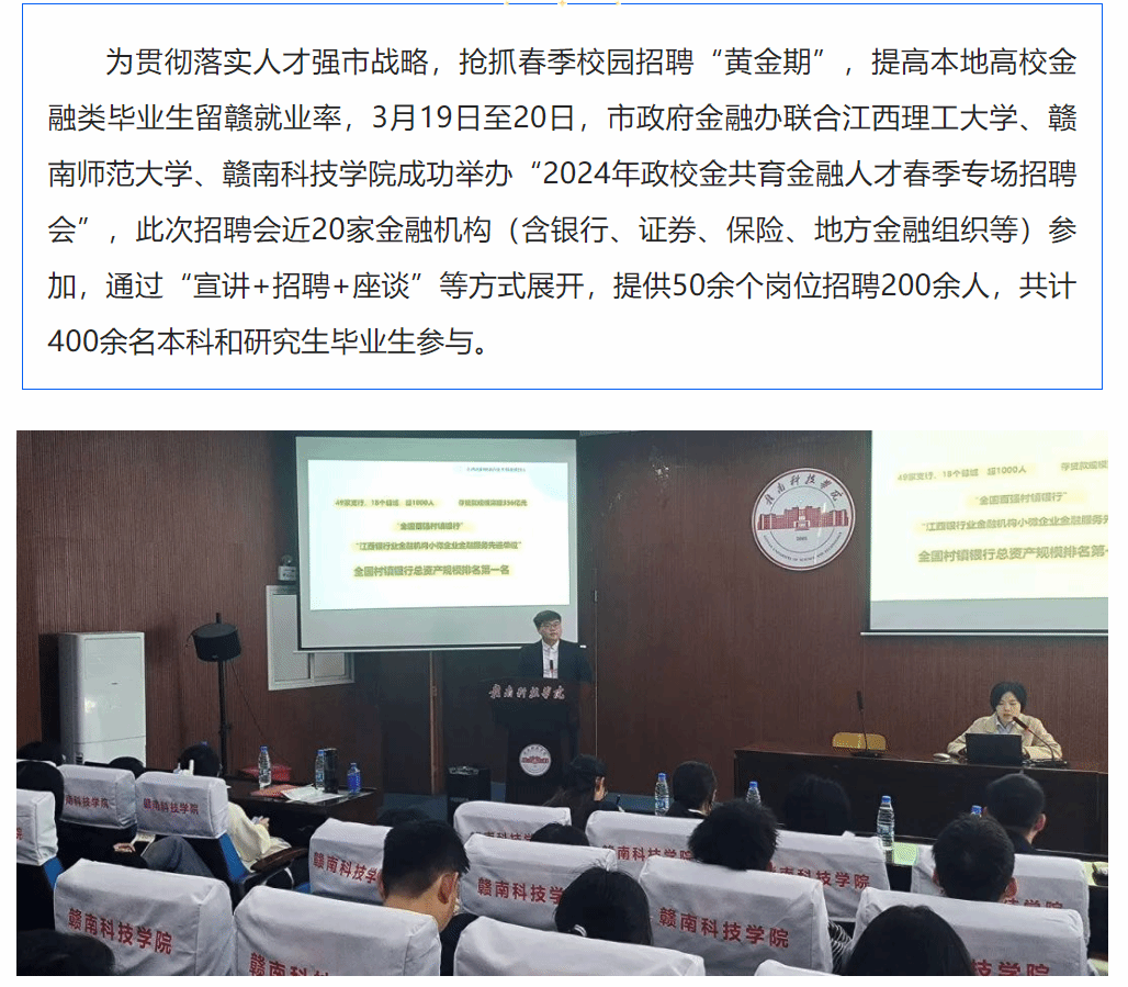 为贯彻落实人才强市战略,抢抓春季校园招聘“黄金期”,提高本地高校金融类毕业生留赣就业率,3月19日至20日,市政府金融办联合江西理工大学、赣南师范大学、taptap点点官方网站成功举办“2024年政校金共育金融人才春季专场招聘会”,此次招聘会近20家金融机构(含银行、证券、保险、地方金融组织等)参加,通过“宣讲+招聘+座谈”等方式展开,提供50余个岗位招聘200余人,共计400余名本科和研究生毕业生参与。