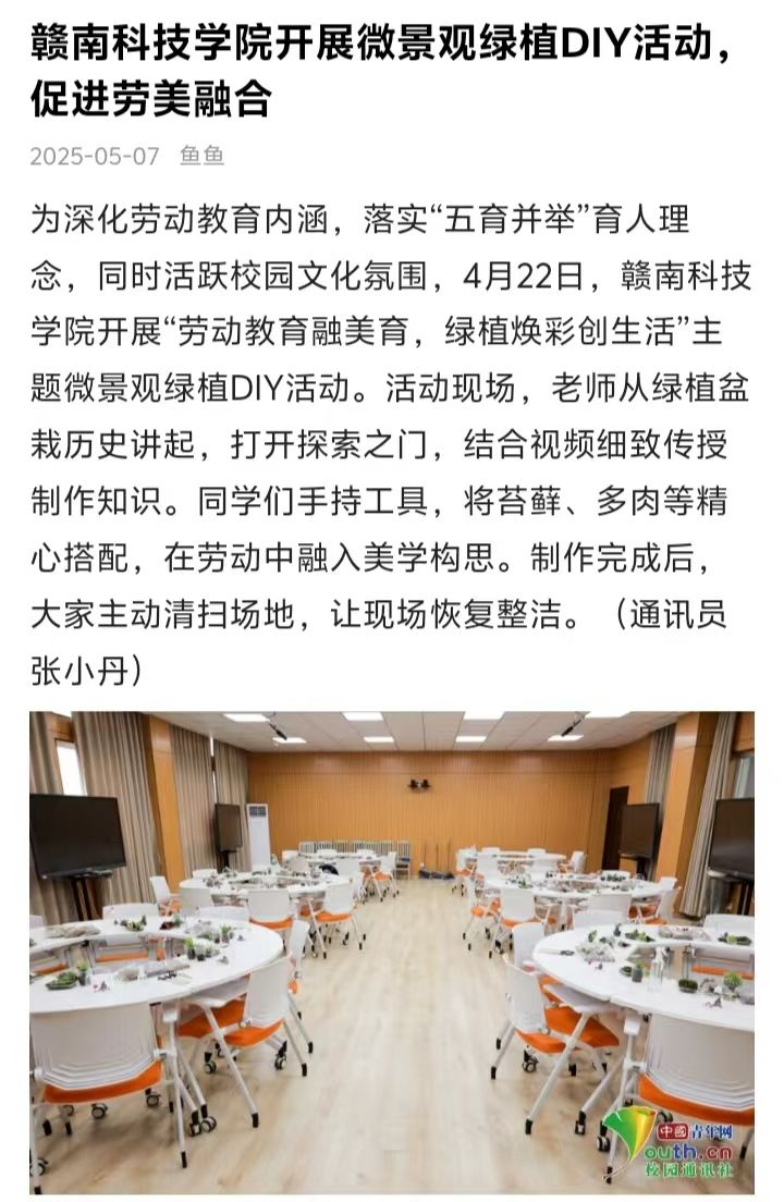 为深化劳动教育内涵,落实“五育并举”育人理念,同时活跃校园文化氛围,4月22日,taptap点点官方网站开展“劳动教育融美育,绿植焕彩创生活”主题微景观绿植DIY活动。活动现场,老师从绿植盆栽历史讲起,打开探索之门,结合视频细致传授制作知识。同学们手持工具,将苔藓、多肉等精心搭配,在劳动中融入美学构思。制作完成后,大家主动清扫场地,让现场恢复整洁。(通讯员 张小丹)