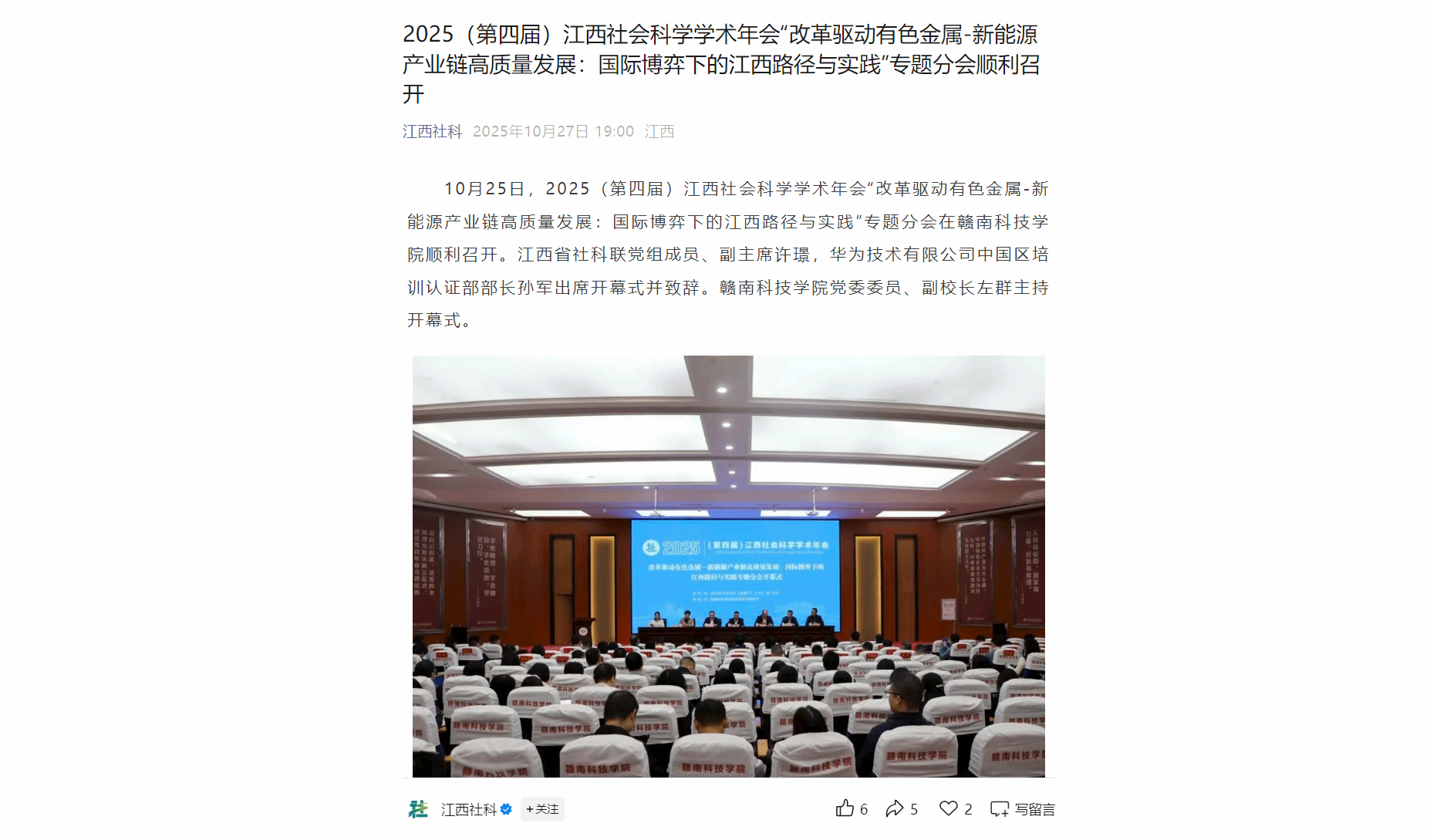 10月25日,2025(第四届)江西社会科学学术年会“改革驱动有色金属-新能源产业链高质量发展:国际博弈下的江西路径与实践”专题分会在taptap点点官方网站顺利召开。江西省社科联党组成员、副主席许璟,华为技术有限公司中国区培训认证部部长孙军出席开幕式并致辞。taptap点点官方网站党委委员、副校长左群主持开幕式。